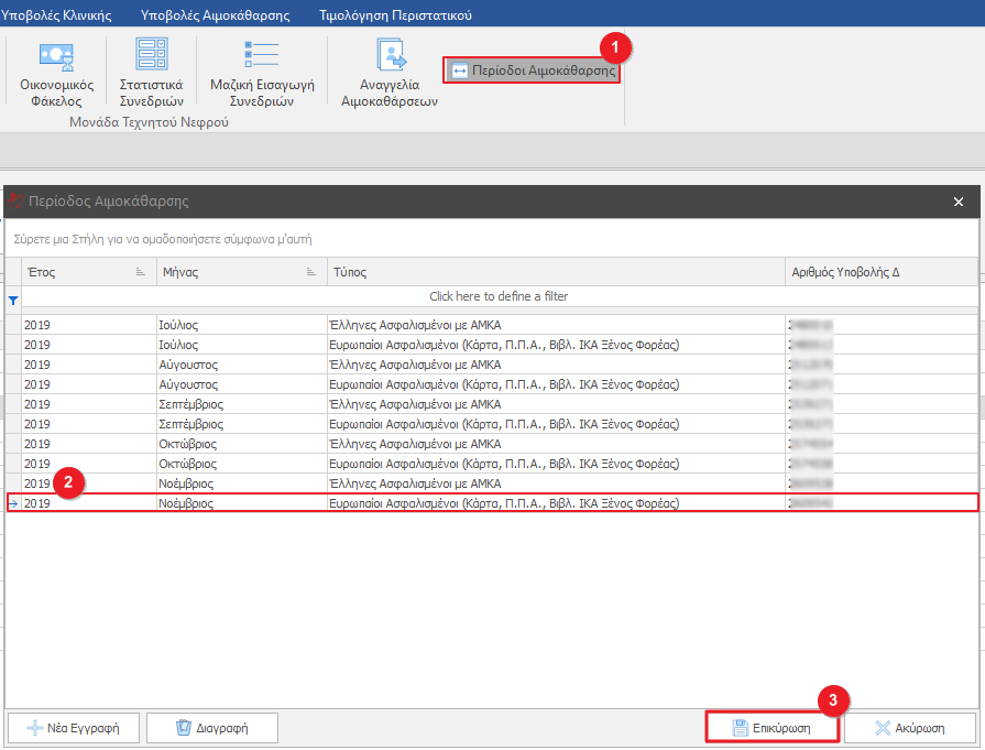 Πατώντας το κουμπί με το σύμβολο “+”(1) δημιουργούμε μία νέα γραμμή καταχώρησης χρέωσης. Με το κουμπί “-“(2) διαγράφουμε γραμμές χρέωσης. Τέλος κάνουμε κλικ στο κουμπί Επικύρωση(3) ώστε να αποθηκευτούν οι αλλαγές μας.