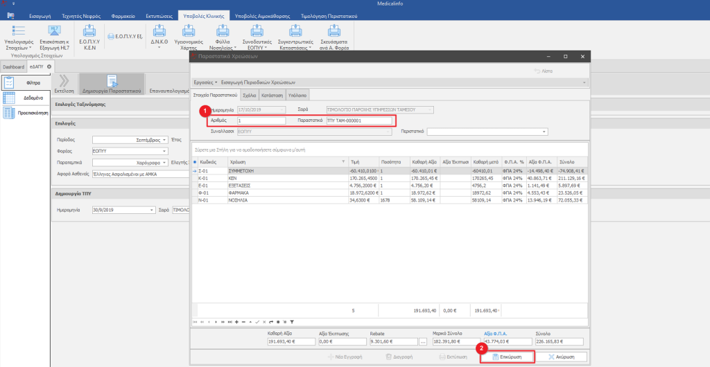 Για να υπολογιστούν οι χρεώσεις κάνουμε κλικ στο κουμπί Υπολογισμός Χρεώσεων(1), εμφανίζονται όλες οι χρεώσεις που έχουμε καταχωρήσει στο περιστατικό και στη συνέχεια πατάμε το κουμπί Τιμολόγηση(2).