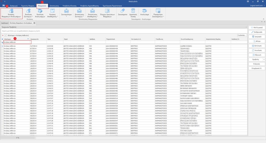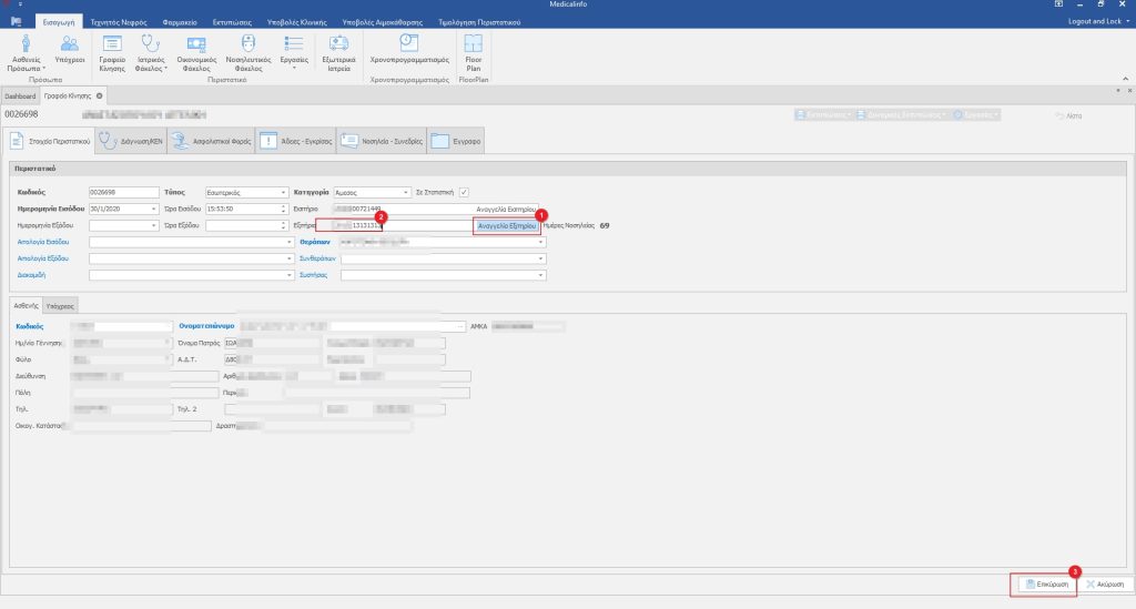 Για να δημιουργήσουμε Νέα Περίοδο Αιμοκάθαρσης κλικάρουμε το κουμπί Περίοδοι Αιμοκάθαρσης(1), στο pop- up παράθυρο κλικάρουμε το κουμπί Νέα Εγγραφή, συμπληρώνουμε τα απαραίτητα στοιχεία και Επικυρώνουμε(3).