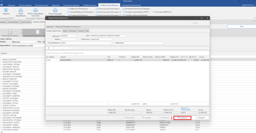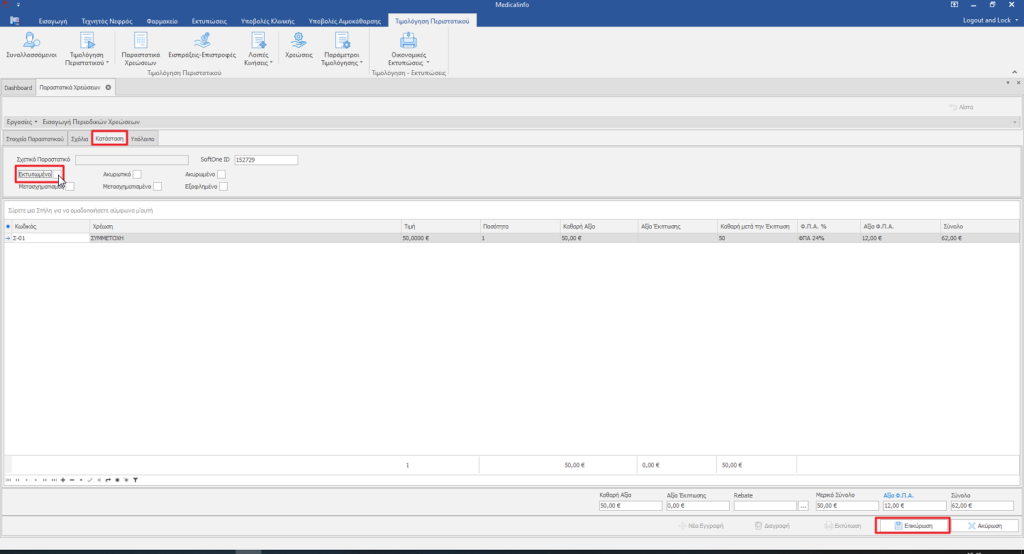 Επιλέγουμε Δημιουργία/Ενημέρωση Παραστατικού, προβάλλεται το παραστατικό,αν δεν επιθυμούμε συγκεκριμένη αρίθμιση ή/και άλλη ημερομηνία έκδοσης πατάμε το κουμπί Επικύρωση(1).