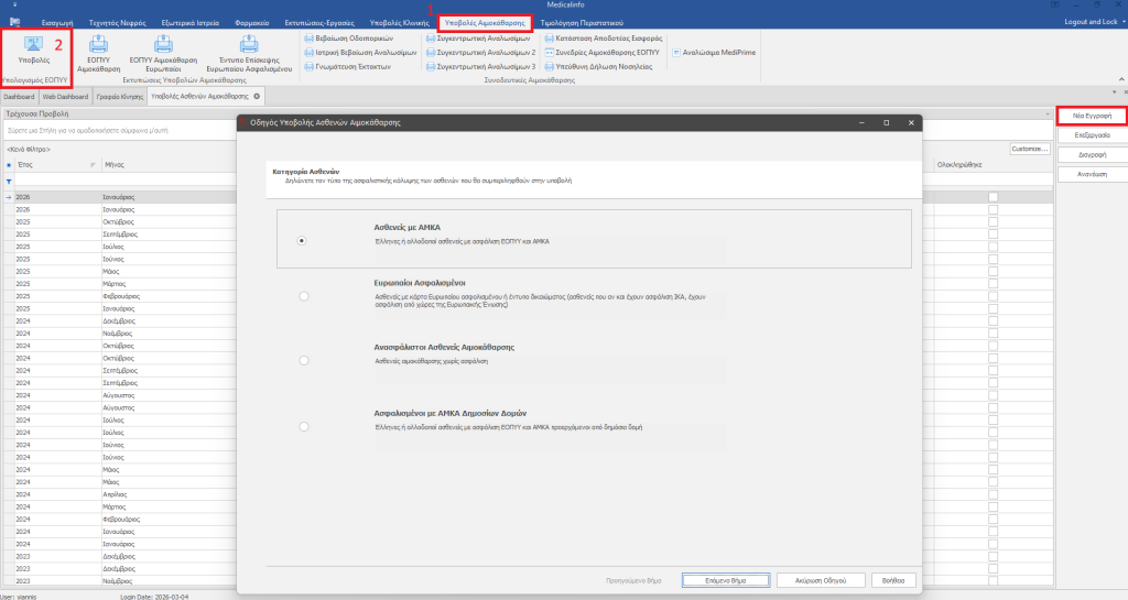 Επιλέγουμε Υποβολές Κλινικής (1) , μετά Υποβολές HL7 (2) και Νέα εγγραφή (3) για να δημιουργήσουμε νέα υποβολή. Εμφανίζεται η δίπλα εικόνα.