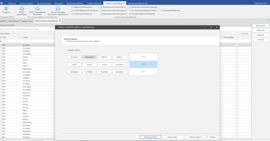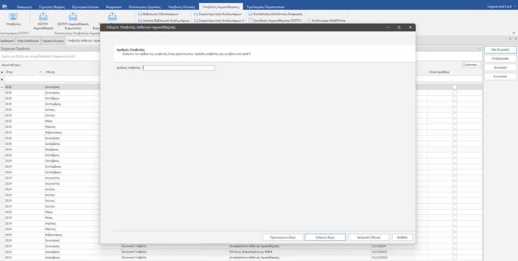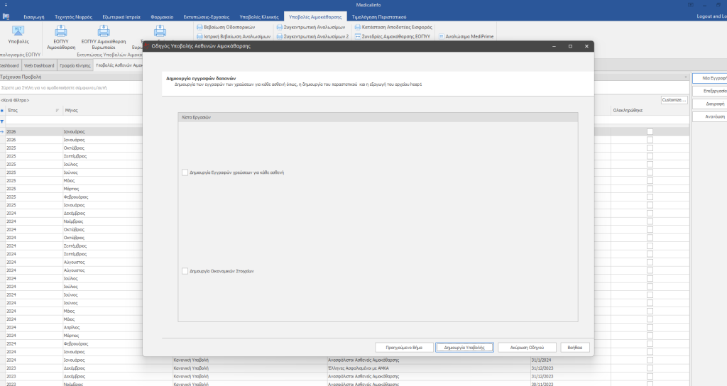 Πριν ξεκινήσετε τη διαδικασία εκτέλεσης της υποβολής Αιμοκαθάρσεων θα πρέπει απαραίτητα να έχετε κάνει εκτέλεση αναλωσίμων για το διάστημα της υποβολής που επιθυμείτε. Για την διαδικασία εκτέλεσης αναλωσίμων κάντε κλικ Εδώ.