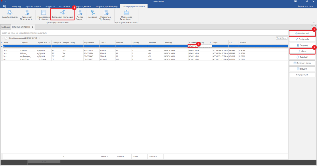 Συνεδρίες:Όπου παρουσιάζονται πληροφορίες των συνεδριών που έχει υποβληθεί ο ασθενής,μπορούμε επίσης να καταχωρήσουμε έκτακτες Χορηγήσεις και Λοιπά Αναλώσιμα.
