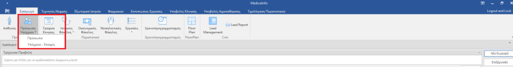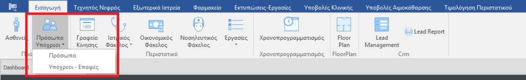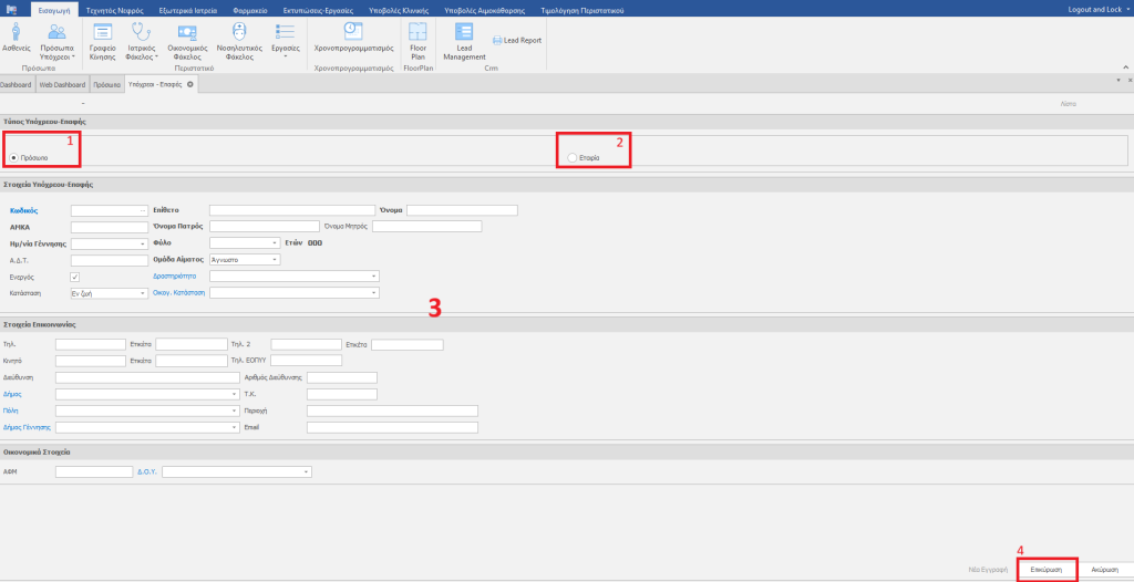 Από το κύριο μενού στην καρτέλα Εισαγωγή επιλέγουμε Υπόχρεοι-Επαφές(1).