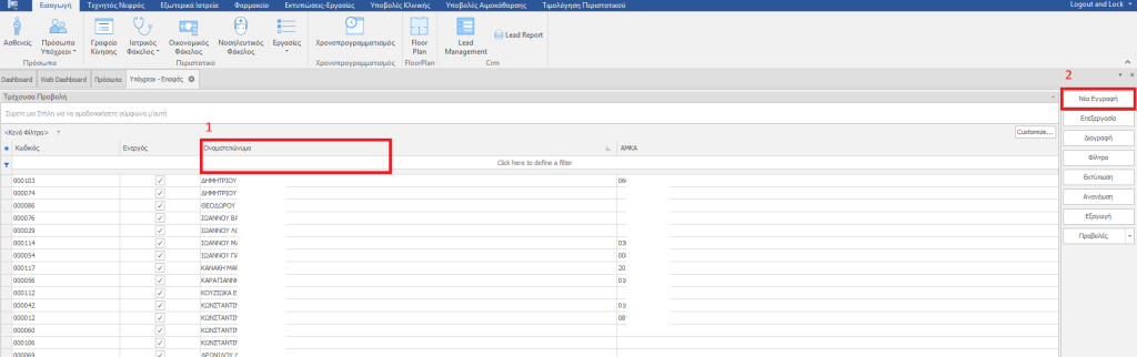 Αν ο Υπόχρεος δεν βρίσκεται στη λίστα κάνουμε κλικ στο κουμπί Νέα Εγγραφή (2).
