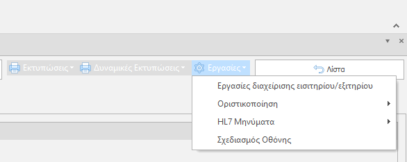 Στο μενού εκτυπώσεις βρίσκονται οι γενικές εκτυπώσεις του γραφείου κίνησης (Εισιτήριο, Εξιτήριο, Ιατρική Γνωμάτευση κλπ).