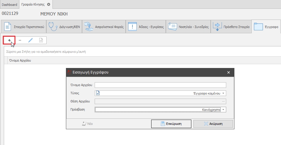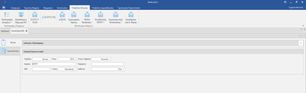 Mετάβαση στο μενού «Υποβολές – Κλινικής» στη συνέχεια επιλογή του ΕΟΠΥΥ / ΚΕΝ. Στο κυρίως παράθυρο εμφανίζεται η παρακάτω φόρμα. Επιλέγουμε τη περίοδο που επιθυμούμε, στο πεδίο Ασθενείς επιλέγουμε τον τύπο Σύμβασης των ασθενών και στο πεδίο ΚΕΝ επιλέγουμε τους εντός ΚΕΝ ή Εκτός ΚΕΝ ανάλογα με το είδος της εκτύπωσης που θέλουμε να εξάγουμε. Παρατηρήστε πως ακριβώς επάνω από τα πεδία των φίλτρων υπάρχει η επιλογή ταξινόμησης που μπορείτε να εμφανίσετε τα αποτελέσματα της εκτύπωσης με διαφορετική ταξινόμηση.