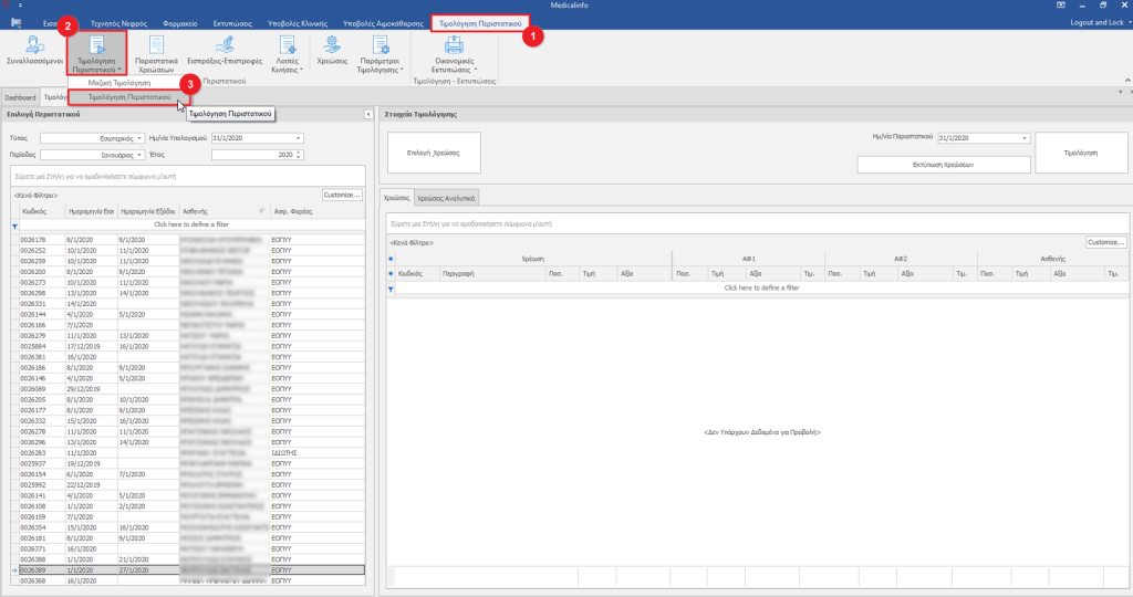 Αν επιθυμούμε να διαγράψουμε μία εγγραφή, την επιλέγουμε και κάνουμε κλικ στο κουμπί με το σύμβολο“-“(1). Στη συνέχεια κάνουμε κλικ ΟΚ(2) στο προειδοποιητικό μήνυμα και τέλος Επικυρώνουμε(3).  Για αλλαγές-διορθώσεις σε υπάρχουσες χρεώσεις, πραγματοποιούμε τις αλλαγές-διορθώσεις και Επικυρώνουμε.