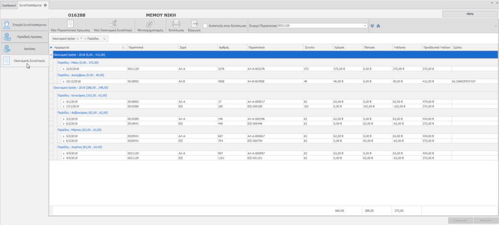 Η καρτέλα Οικονομικές Συναλλαγές περιέχει όλες τις οικονομικές κινήσεις του συναλλασσόμενου.